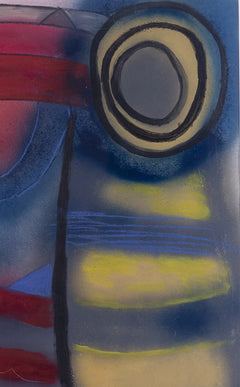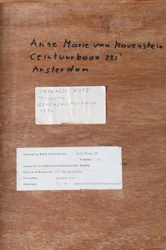 Abstract werk met donkere kleuren door Annemarie Ravenstein. Gemengde techniek op papier, met hout en plastic omlijst. Gedateerd en gesigneerd. Datering: 1984. Conditie: het werk is in goede staat de plastic omlijsting is lichtbeschadigd. Afmetingen: 100 x 75 cm.