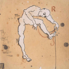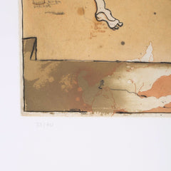 Colino, 'R/Hiram'; 2004. Ets op papier zonder lijst, oplage 33/40. Afbeelding van een naakte man in een ruimte met op de vloer een weerspiegeling van een liggend naakte man. Conditie: goed. Afmeting 66 x 50 cm.