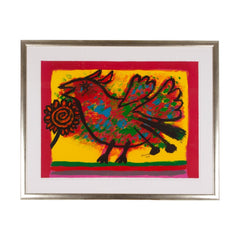 Corneille, 'La Peschiera', 2009. Litho, oplage van 130. Kleurrijke voorstelling van een gevleugeld fantasiedier. Signatuur 'Corneille 09', rechtsonder. Corneille (1922-2010) was een schilder en grafisch kunstenaar die begin jaren vijftig de conservatieve Nederlandse kunstwereld radicaliseerde. Samen met vijf andere invloedrijke kunstenaars, waaronder Karel Appel en Constant, richtte hij in 1948 de naoorlogse Europese expressionistische beweging CoBrA op. Corneille volgde tussen 1940 en 1942 cursussen tekenen en etsen aan de Academie van Beeldende Kunsten in Amsterdam, maar wordt over het algemeen beschouwd als een autodidactische schilder. Aanvankelijk sterk beïnvloed door het werk van Picasso maakte Corneille abstract werk. Vanaf de late jaren zestig krijgt Corneilles werk een meer figuratief karakter. In dit werk zijn vogels, vrouwen en bloemen vaak het onderwerp. Conditie: goed. Afmetingen: werk 104 x 78 cm, lijst 107.3 x 131.1 cm.