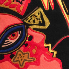 Corneille, Tapijt 'L'Oiseau presque déraisonnable'; 2008. Handgetuft wollen vloer- of wandkleed met daarop een voorstelling van een vogel boven een portret en profil voor een zwarte achtergrond. Oplage van 125, onderin de signatuur 'Corneille'. Aan de achterzijde is een label met echtheid certificaat bevestigd en een papieren certificaat van echtheid wordt meegeleverd. Corneille (1922-2010) was een schilder en grafisch kunstenaar die begin jaren vijftig de conservatieve Nederlandse kunstwereld radicaliseerde. Samen met vijf andere invloedrijke kunstenaars richtte hij in 1948 de naoorlogse Europese expressionistische beweging CoBrA op. Aanvankelijk sterk beïnvloed door het werk van Picasso maakte Corneille abstract werk. Vanaf de late jaren zestig krijgt Corneille's werk een meer figuratief karakter. In dit werk zijn vogels, vrouwen en bloemen vaak het onderwerp. Conditie: als nieuw. Afmetingen: ø 216 cm.