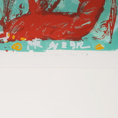 D. Chan, 'Suchi'; 1991. Zeefdruk op papier in metalen lijst, oplage 25/50. Abstracte voorstelling in blauw, rood en wit met figuren en vissen. Linksonder oplagenummer en titel, rechtsonder signatuur en jaartal. Conditie: goed, gebruikssporen aan lijst. Afmeting werk zonder lijst: 58 x 71 cm.