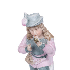 Drie beeldjes van keramiek: Beeld van een jongen die blaast op een hoorn van een dier. Het beeld is aan de voorkant geschilderd, aan de achterkant is het beeld wit. De jongen draagt blauw met roze kleding; Twee kleine beeldjes van een dame en een heer, geglazuurd. Ze dragen kleding in de kleuren roze, geel en wit. Datering onbekend. Conditie: beschadigingen zoals kleine chipjes, van de jongen is een vinger afgebroken, van de kleine beeldjes zijn de kleuren hier en daar versleten. Afmetingen muzikantje: 23 x 7 x 7 cm; Afmetingen dame en heer: 8 x 2,5 x 2,5 cm.
