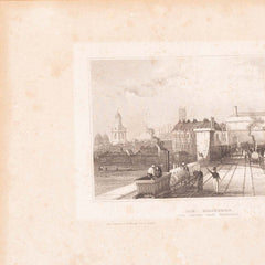 Drie prenten met een treinthema: 'Marc Séguin. Inventeur de la Locomotive à grande vitesse'. Staalgravure door L. Melois van Marc Seguin (1786 - 1875), een Franse ingenieur. Hij vond in 1824 samen met zijn broer Camille (1793-1852) de hangbrug uit en hij ontwierp de eerste spoortunnels in Frankrijk. Datering: eind 19e eeuw; 'Die Eisenbahn von London nach Greenwich', Bibliographisches Institut, Hildburghausen. Gravure en ets van het gezicht op de spoorweg van Londen naar Greenwich, met Greenwich op de achtergrond. Datering: ca. 1840; Sächs Schweiz. 'Schandau'. Litho van C.W. Arldt, druk van J. Braunsdorf, uitgegeven door E. Müller in Dresden. Zicht op de Saksisch-Boheemse Spoorweg, Sächsisch-Böhmische Staatseisenbahn. Datering: circa 1850. Conditie: De prenten hebben sporen van ouderdom. Verkleuring, veel vlekken en kleine beschadigingen aan de randen. Afmetingen van papier prenten: ca. 17 x 12 cm; 19 x 28 cm; ca. 20 x 29 cm.