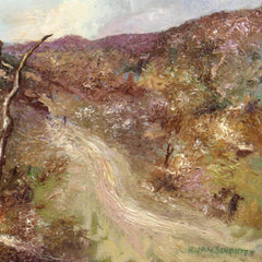 H. Jan Schouten, 'Aruba', 1986. Olieverf op doek. Landschapsschilderij met pad door bergachtig gebied. Titel op de achterkant van het doek. Signatuur rechtsonder. Jan Schouten (Rotterdam 1906 - Gouda 1987) volgde na een kort bestaan als priester en als godsdienstleraar in Eindhoven de Academie voor Beeldende Kunst te Tilburg. Daarna vestigde hij zich als kunstenaar in Gouda en werd later directeur van de stedelijke Musea Gouda. Conditie: goed, sporen van gebruik aan lijst. Afmetingen: beeldvlak 50,2 x 40,3 cm, met lijst 51,4 x 41,5 x 2,5 cm.