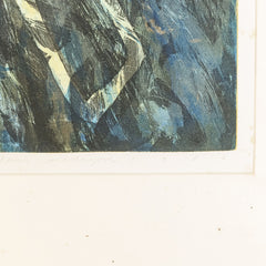 Hans Vredegoor, 'CXL'; 1986. Ets in metalen lijst, oplage 34/35. Abstracte voorstelling van wilde lijnen en vormen op een achtergrond in blauw-tinten. Linksonder titel en oplagenummer, rechtsonder signatuur en jaar. Conditie: goed, gebruikssporen aan lijst. Afmeting lijst: 81 x 61 cm.
