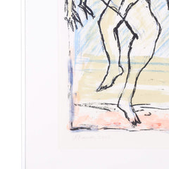 Hannie Ramaer, 'Dans'; 2002. Zeefdruk op papier in metalen lijst, oplage 3/60. Abstracte voorstelling met een groep mensen kijkend naar vogel-figuren. Linksonder signatuur en jaar, in midden titel, rechtsonder oplagenummer. Conditie: goed, gebruikssporen aan lijst. Afmeting werk zonder lijst: 94 x 62 cm.
