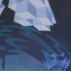 Hans Klaui, 'Zonder titel'; 1987. Zeefdruk op papier in metalen lijst, oplage E.A. Abstracte voorstelling van een planeet-achtige vorm in paars en blauw met daarboven lila kubusvormen voor een donkere achtergrond. Signatuur en oplagenummer linksonder. Conditie: goed, gebruikssporen aan lijst. Afmeting werk zonder lijst: 35 x 45 cm, 51 x 61 cm.