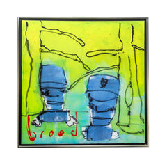 Herman Brood, '2 Figuren', jaartal onbekend. Acryl op doek in zilverkleurige lijst. Afbeelding van twee figuren in blauw voor een geel-groene achtergrond. Linksonder in rood gesigneerd met 'brood'. Het werk is met meerdere lagen geschilderd waarbij delen van de onderlaag tevoorschijn zijn gekomen wat een extra dimensie aan het werk geeft. Een certificaat van echtheid is bijgeleverd. Conditie: goed. Afmeting doek: 100 x 100 cm.
