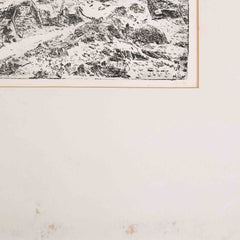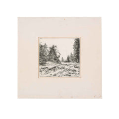 Herman van Tongeren, 'Grote Boomstronk'; 1969. Ets in wit passe-partout. Afbeelding van een paadje over een heuvel met daarnaast een boomstronk en naaldbomen. Conditie: beschadigingen aan de passepartout, maar werk is in goede conditie. Afmeting werk: 18 x 19 cm.