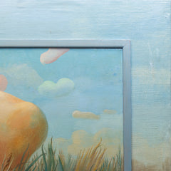 Ineke Ebbinge, 'Geboorte, Leven en Dood (2/3)', 1977. Olieverf op doek zonder lijst. Surrealistische afbeelding van een bot dat boven een grasveld uitsteekt. Op het werk is een lijst geplakt. Signatuur rechtsonder. Conditie: kleine beschadigingen aan de randen. Afmetingen: 54 x 64,5 cm.