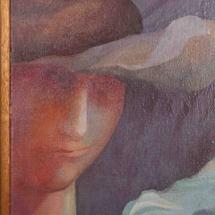Ineke Ebbinge, 'Verhouding 1', 1961. Olieverf op doek in houten omlijsting. Fantasievolle compositie met een man en een vrouw in rood, blauw en paars. Signatuur midden onder. Conditie werk: aan de randen een beetje beschadigd, verder in prima staat. Afmetingen: ca. 66 x 62 cm.