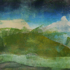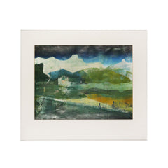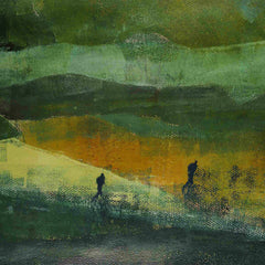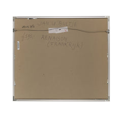 Jan Bultje, 'Renaisson (Frankrijk)'; jaartal onbekend. Monoprint op papier in metalen lijst. Afbeelding van een landschap in blauw, groen, wit en geel met daarin de silhouetten van twee wandelende fihuren. Conditie: gebruikssporen aan de lijst. Afmeting lijst: 70 x 80 cm.