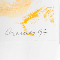 Jan Cremer, 'Sahara I', 1997. Zeefdruk in zilverkleurige lijst, oplage van 60. Abstracte voorstelling met drie zwarte hartvormen voor een gele achtergrond. Linksonder oplagenummer, rechtsonder signatuur en jaar. Conditie: goed, lichte gebruikssporen aan lijst. Afmeting lijst: 81 x 100 cm.