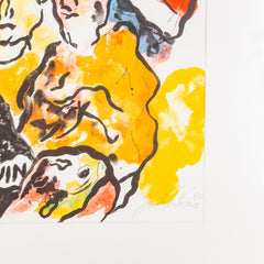 Jan Sierhuis, 'Zonder titel'; 2000. Litho in zilverkleurige lijst, oplage van 35. Kleurrijke voorstelling van drie personen in oranje en blauwe kleding met Nederlandse vlaggen op de achtergrond. Conditie: goed, gebruikssporen aan lijst. Afmeting werk zonder lijst: 50 x 62 cm.