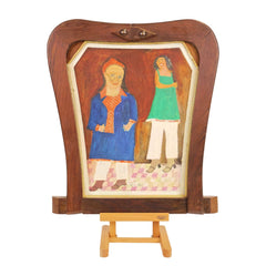 Jan Strijbos, 'Ave Maria', 1975-1980. Olieverf op hardboard in houten lijst. Volledig portret van twee personen op bruine achtergrond met tegelvloer. Titel middenonder. Signatuur rechtsonder. Jan (Johannes) Strijbos (Eindhoven 1896 - Merkelbeek 1977) was timmerman van beroep en na zijn pensioen een autodidact-kunstschilder in de naïeve stijl. Hij maakte zijn houten lijsten zelf. Conditie: goed; lijst vertoont gebruikssporen. Afmetingen: beeldvlak 36 x 30,5 cm, met lijst 46 x 43 x 4 cm.