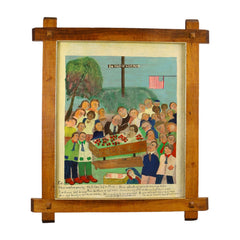 Jan Strijbos, 'De Heer is niet meer' (begrafenis van Nixon), 1960-1980. Olieverf op hardboard in eikenhouten lijst met hoekdecoratie. schilderij van een groep mensen rond een doodskist met onderin een psalm over Nixon. Titel op het kruis. Signatuur rechtsonder. Jan (Johannes) Strijbos (Eindhoven 1896 - Merkelbeek 1977) was timmerman van beroep en na zijn pensioen een autodidact-kunstschilder in de naïeve stijl. Hij maakte zijn houten lijsten zelf. Conditie: vertoont gebruikssporen. Afmetingen: beeldvlak 57 x 47 cm, met lijst 74 x 64,3 x 2,5 cm.