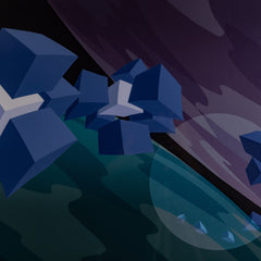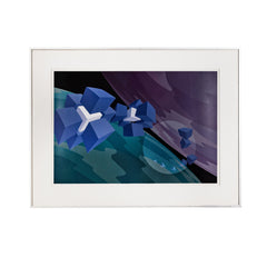 Hans Klaui, 'Zonder titel'; 1987. Zeefdruk op papier in metalen lijst, E.A. Abstracte voorstelling van blauwe en witte kubus vormen voor twee planeet-lijkende cirkels. Conditie: goed, gebruikssporen aan lijst. Afmeting werk zonder lijst: 43 x 63 cm.