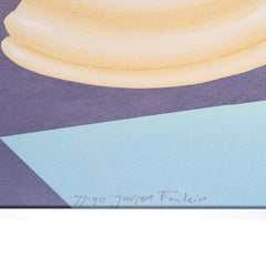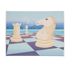 Jurjen Fontein, 'Schaak'; jaartal onbekend. Zeefdruk op papier in metalen lijst, oplage 77/90. Close-up van een schaakbord met wit paard, toren en koningin. Het paard blaast lucht uit. Onderaan signatuur oplagenummer. Conditie: goed, gebruikssporen aan lijst. Afmeting werk zonder lijst: 49 x 64 cm.