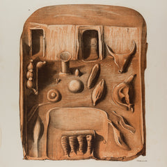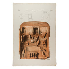 Litho gemaakt door Tiemen Hooiberg voor de eerste complete catalogus van de Egyptische collectie van het Rijksmuseum van Oudheden. De litho toont een afbeelding van een Oud-Egyptische offertafel met voedseloffers, in oranjebruin. Alle objecten zijn te bekijken in de collectiedatabase van de site van het museum. Van 1830 tot 1889 werkte Tiemen Hooiberg in het Rijksmuseum van Oudheden te Leiden als opgravingtekenaar, lithograaf en amanuensis. Datering: 1840. Conditie: De prenten vertonen sporen van ouderdom, zoals verkleuring, vlekken en beschadigingen, mn aan de randen. Lichte afdruk van een andere litho zichtbaar. Afmetingen: ca. 54 x 37 cm.
