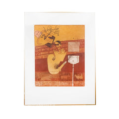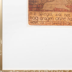 Michel van Overbeeke, 'De spiegel', 1979. Ets in goudkleurige lijst, oplage 14/30. Fantasierijke compositie in bruin en rood. Rechtsonder signatuur. Afkomstig uit de collectie van het Frans Hals Museum. Afmetingen lijst: 91 x 70,5 cm, beeldvlak: 60 x 49,5 cm. Conditie: werk is in goede conditie, lijst toont lichte gebruikssporen en plakresten.