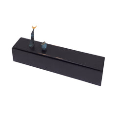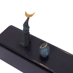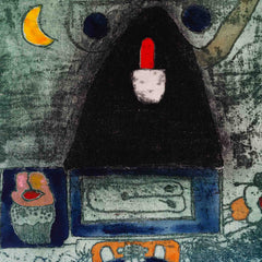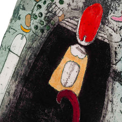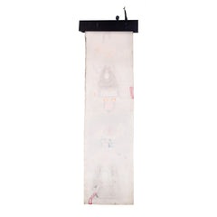 Michel van Overbeeke, 'Love Curtain', 1992. Kleurenets op doek in houten opbergdoos met daarop twee bronzen sculptuurtjes, oplage 55/60. Op de scroll is een abstracte kleurrijke voorstelling aangebracht waar de kunstenaar met de hand details in bladgoud op heeft gemaakt. In de hoek rechtsonder (vervaagd) de signatuur en oplagenummer. De scroll zit opgerold een houten doosje, met twee metalen ophang haakjes. Als de scroll is uitgerold kunnen de haakjes aan het kistje bevestigd worden en zodanig kan het opgehangen worden. Het deksel met sculptuurtjes kan dan op het kistje geplaatst worden. Conditie: de scroll is in goede conditie, het kistje toont hier en daar gebruikssporen, met name waar de haakjes bevestigd zijn geweest. Afmeting: uitgerolde scroll 150 x 47 x 9 cm; opbergkist: 21 x 47 x 9 cm.