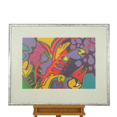 M.Y. Naerebout, 'Go with the flow'; 1995. Zeefdruk op papier in zilverkleurige lijst, oplage 12/150. Kleurrijke abstracte voorstelling met dierlijke vormen. Linksonder oplagenummer en titel, rechtsonder signatuur en jaar. Conditie: goed, gebruikssporen aan lijst. Afmeting werk zonder lijst: 48 x 69 cm, incl lijst: 76 x 92 cm.