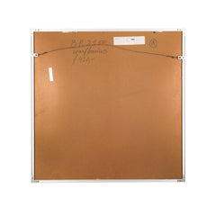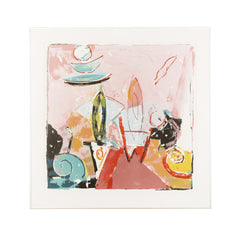 Piet Warffemius, 'Water en vuur'; 1986. Zeefdruk op papier in metalen lijst, oplage 3/60. Abstracte voorstelling van kleurrijke vormen voor een roze achtergrond. Linksonder titel, in midden signatuur, rechtsonder jaartal en oplagenummer. Conditie: goed, gebruikssporen aan lijst. Afmeting werk zonder lijst: 67 x 67 cm.