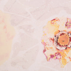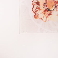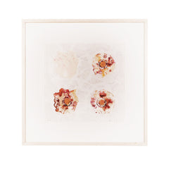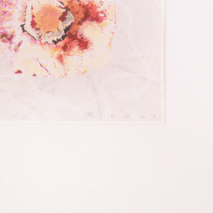 Rob de Graaf, 'Chaos is een aparte werkelijkheid'; 2001. Zeefdruk op papier in wit houten lijst, E.A. Abstracte illustratie lijkend op bloemen voor een witte achtergrond. Linksonder in potlood e.a., rechtsonder signatuur en jaar. Conditie: goed, gebruikssporen aan lijst. Afmeting werk zonder lijst: 46 x 46 cm.