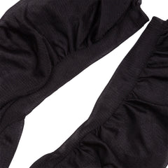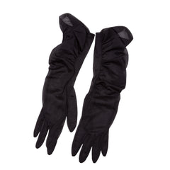 Rodo clutch met twee paar zwarte avondhandschoenen, 20e eeuw. Zwart leren Rodo clutch met goudkleurige ketting. De binnenzijde is van zwart leer en heeft een klein opbergvakje met spiegel en kammetje. Aan de bovenzijde kan de tas geopend worden via een goudkleurige knoop; Een paar avondhandschoenen van suède (7,5) en een paar van tule. Conditie: gebruikt, slijtage aan de buitenzijde; bij kammetje ontbreken tanden. Afmetingen clutch: ca. 13 x 23,5 x 3,5 cm; hoogte met hengsel 51 cm. Afmetingen handschoenen: ca. 36 x 8 cm, ca. 33 x 8 cm.