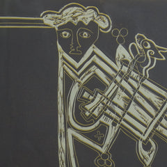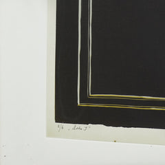 Rose Marijke Weiss, 'Letter J'; Jaartal onbekend. Lino in houten lijst, oplage 2/6. Zwart-wit voorstelling met gouden schaduw van de letter J. De letter is versierd met een menselijke figuur en verschillende dierenfiguren zoals een kip. Linksonder de lino bevindt zich oplage, titel en rechtsonder signatuur. Conditie: De lino is in goede conditie, al toont de lijst sporen van gebruik. Afmetingen: beeldvlak 55 x 59 cm.