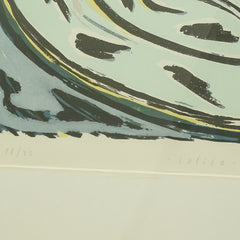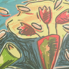 S. van der Lande, 'Lolita'; 1990. Zeefdruk, oplage 17/25. Kleurrijke geabstraheerde voorstelling met tulpen. Afmetingen: beeldvlak 66 x 50 cm. Conditie: Het werk is in goede conditie maar de lijst toont sporen van gebruik en zit een beetje los.
