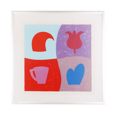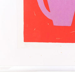 S. van der Lande, 'Vorm & kleur I'; 1995. Zeefdruk op papier in metalen lijst, oplage 16/25. Kleurrijke compositie in rood, blauw en paars verdeeld in vier vlakken. Linksonder oplagenummer, daarnaast titel, rechtsonder signatuur en jaar. Conditie: goed, gebruikssporen aan lijst. Afmeting lijst: 84 x 84 cm.