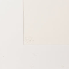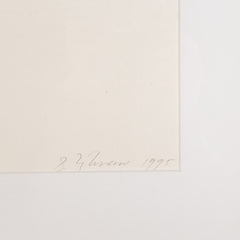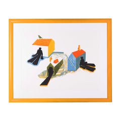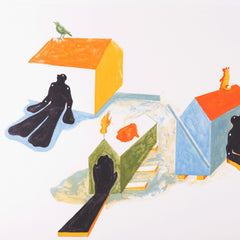 S. Zijlmans, 'De situatie achter d.d. 31 januari 1995'; 1995. Zeefdruk op papier in houten lijst, 38/50. Drie gebouwtjes met figuren in zwart er tegenaan, op de daken een vogel en een kat. Linksonder oplagenummer, in midden titel en rechtsonder signatuur met jaartal. Conditie: goed, gebruikssporen aan lijst. Afmeting werk zonder lijst: 46 x 62 cm.