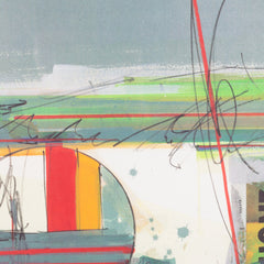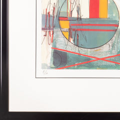 Sam Middleton, 'Polder', 1997. Zeefdruk, oplage E/A, met passe-partout in zwarte lijst. Abstracte compositie met een cirkel, vlakken en lijnen. Ook zijn er fragmenten van kranten zichtbaar. Signatuur en datering rechtsonder. Amerikaanse kunstenaar Sam Middleton (1927-2015) groeide op in New York en heeft over de hele wereld gewoond tot hij in 1961 naar Nederland kwam. Middleton is autodidact, maar heeft lesgegeven aan de Ateliers '63 Haarlem en aan de Koninklijke Academie in Den Bosch. Muziek, vooral jazz, en het Hollandse landschap vormden de grootste inspiratiebronnen voor het abstracte en expressionistische werk van Middleton. Hij heeft met name collages gemaakt, waarin hij partituren en foto's verwerkte. Middleton combineert deze vaak met beschilderde vlakken die samen een ritmische en dynamische uitgewogen compositie vormen. Conditie: goed, lichte gebruikssporen aan de lijst. Afmetingen: 78 x 67 cm.