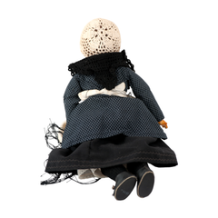 Set van twee poppen, dolster en boetster. Datering 20e eeuw. Pop van een dolster van de Noord-Friese kust door Cisca Heere, circa 1985. Pop in klederdracht, voorstellende een nettenboetster met stoel, boetprop en net. Condite: De poppen zijn in goede conditie, de middelvinger van de dolster is beschadigd en er mist een tand van de vork. Afmetingen: Dolster: breedte 13,5 cm, lengte 40,5 cm. Boedster: hoogte 37 cm, breedte 20 cm, lengte 10 cm.