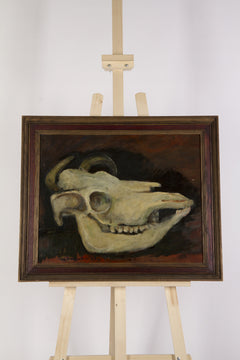 Theo Swagemakers, 'Stilleven van ossenkop', 1965. Olieverf op board, werk 48.5 x 60.5 cm, lijst 59.8 x 71.6 cm. Stilleven met de schedel van een os tegen een zwart-rode achtergrond. Gesigneerd linksonder. Het werk is ingelijst in een houten lijst. Theo Swagemakers (1898-1994) is een bekende Nederlandse schilder van voornamelijk portretten en stillevens. Hij genoot zijn opleiding in Brussel en Parijs en heeft verschillende beroemdheden mogen portretteren, zoals een groot deel van de Koninklijke familie. Hiervoor heeft hij de Thérèse van Duyl-Schwartzeprijs in ontvangst mogen nemen in 1958. Conditie: het werk is in prima conditie. Hier en daar is een putje in de verf te zien. Lijst heeft gebruikssporen.
