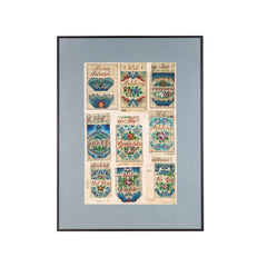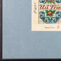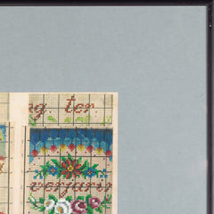 Vel met kopieën van originele patronen voor kralentassen uit de 19e eeuw, in zwart metalen lijst. Afgebeeld zijn kleurrijke bloempatronen met verschillende teksten, zoals: "Ter verjaring", "Leef gelukkig" en "Uit Liefde". In de 19e en begin 20e eeuw waren kralentassen en -buidels erg in de mode. Hoewel het bepaald niet gemakkelijk was, werd met name het breien van tassen populair. De patronen werden gebruikt om de duizenden kralen in juiste volgorde op het garen te rijgen, voordat vervolgens de tas gebreid kon worden. Door de bewerkelijke en tijdrovende techniek behoorden deze kralentassen tot de luxueuze producten. In Nederland vonden de gebreide kralentassen uit Duitsland zoveel aftrek in de klederdrachten dat de Nederlandse vrouw de kralentassen ook zelf ging breien om aan de zilveren beugel te zetten. Conditie: het vel bestaat uit twee delen en is aan de achterzijde met plakband aan elkaar bevestigd, vlekken op het vel; gebruikssporen lijst. Afmetingen lijst: 65,5 x 50,5 cm. Afmetingen vel: 47,5 x 31,5 cm.