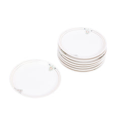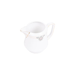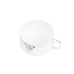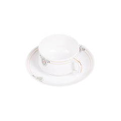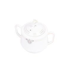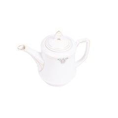 Theeservies, 20-delig. Theeservies met een witte basiskleur en versieringen in goud, roze en groen. Het servies bestaat uit een theepot, suikerpot, melkkannetje, kom, 8 kopjes en 8 schotels. Bovenop de deksels zitten decoratieve handvatten. Datering onbekend. Conditie: het servies vertoont sporen van gebruik, de gouden lijnen zijn hier en daar vervaagd. Afmetingen: theepot ca. 16 x 18 x 10 cm; suikerpot ca. 11,5 x 13 x 9 cm; melkkan ca. 9 x 11 x 7 cm; kom ca. 6,5 x ø12 cm; kopje ca. 4,5 x 7,5 x 9,5 cm; schotel ca. 1,5 x ø13 cm.